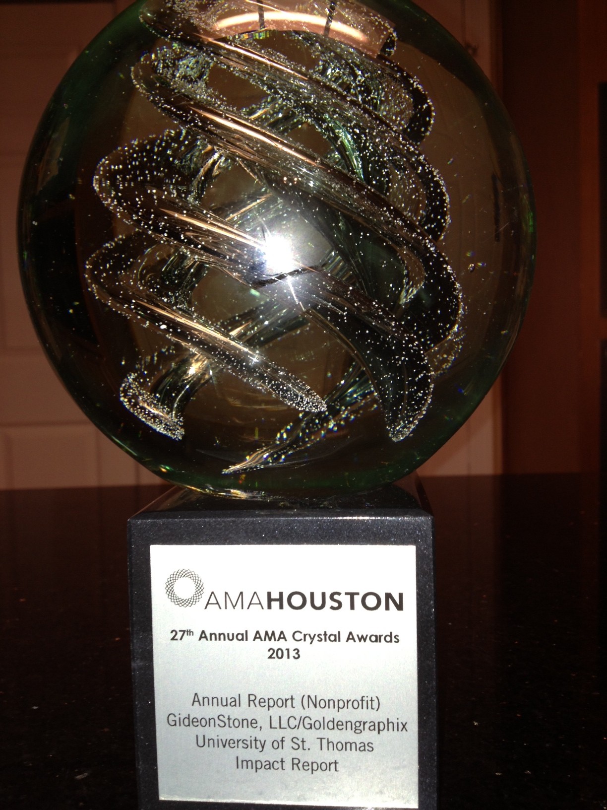 During the 2013 American Marketing Association-Houston Crystal Awards ceremony May 23, the University of St. Thomas impact report produced by GideonStone, LLC, in partnership with world-class design firm Goldengraphix, took top honors in the Publication Cover Design and Annual Report-Nonprofit categories.